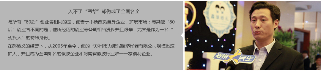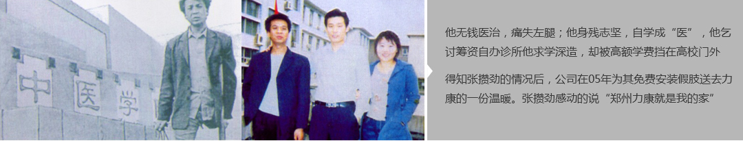 鄭州市力康假肢矯形器有限公司(簡稱力康),是一家專業(yè)從事假肢矯形器的設(shè)計、研發(fā)、制作及裝 配的專業(yè)機構(gòu)。成立于1992年是河南省唯一一家福利企業(yè)。力康下設(shè)業(yè)務(wù)部、技術(shù)部、住院部、康復(fù) 部、售后服務(wù)部,并配有現(xiàn)代化的裝配車間和功能齊全的訓(xùn)練大廳,為殘疾朋友康復(fù)訓(xùn)練提供了可靠 保障??偨?jīng)理穿戴假肢多年,有著豐富的臨床經(jīng)驗和親身體會;多年來,力康已為全國幾十萬名殘疾 朋友安裝上舒適、美觀、耐用的假肢和矯形器具,使他們更大限度地恢復(fù)了正常的工作和生活。“產(chǎn) 品即人品”的質(zhì)量理念、先進(jìn)的技術(shù)、實惠的價格、完善的售后服務(wù)是力康取勝的法寶……